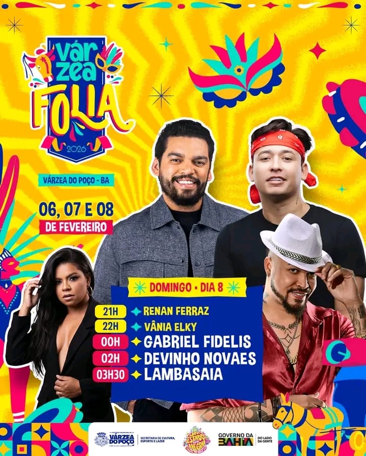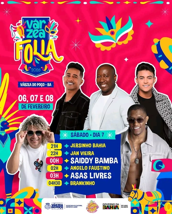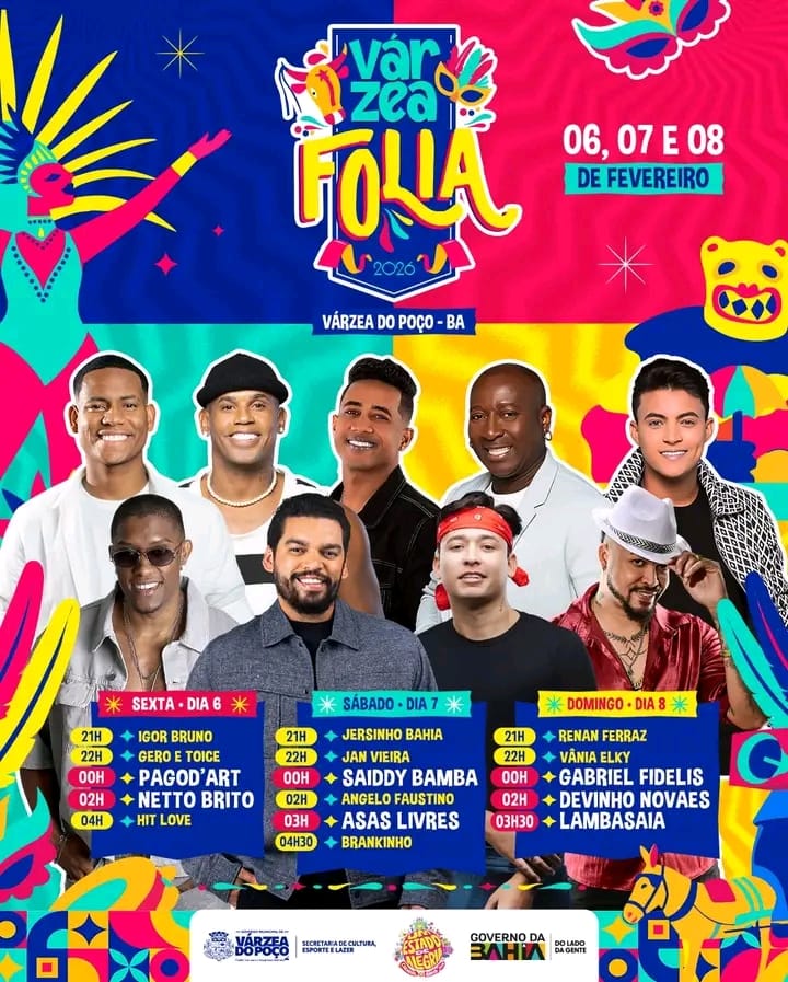 O Carnaval de Várzea do Poço segue atraindo grande público e mantendo o clima de festa na cidade com uma programação marcada por diversidade musical e artistas de destaque no cenário regional e nacional. As apresentações desta noite reúnem nomes consagrados do arrocha e do pagode, ritmos que fazem parte da identidade das festas populares da Bahia e do Nordeste…